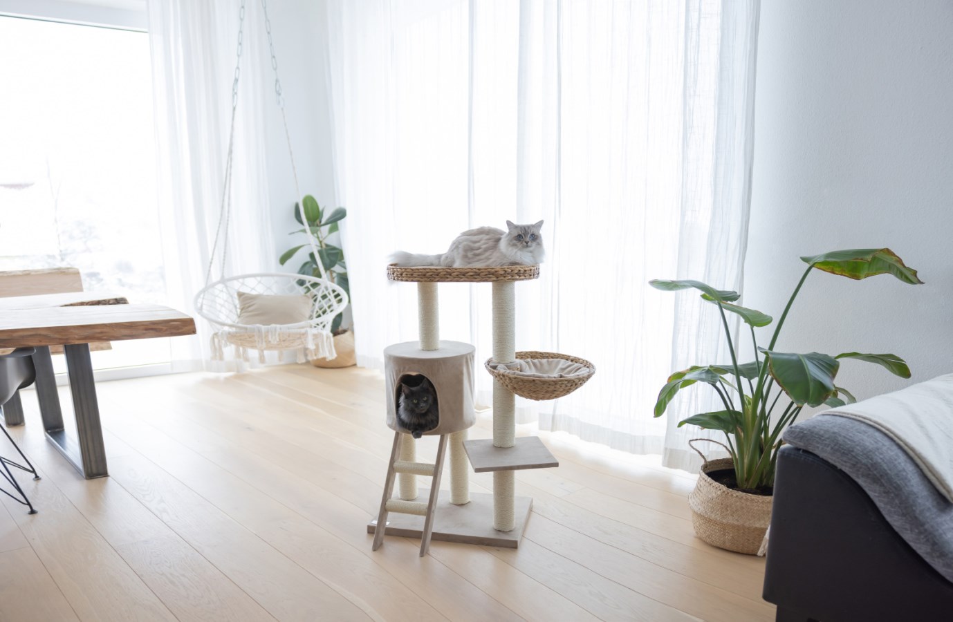 Der kleine Katzenbaum mit Katzenbett aus Banana Leaf und abnehmbarem Katzenkissen ist ein echter Hingucker. Die stabile Bodenplatte mit Sisal dient als zusätzliche Kratzmatte oder Kratzbrett.