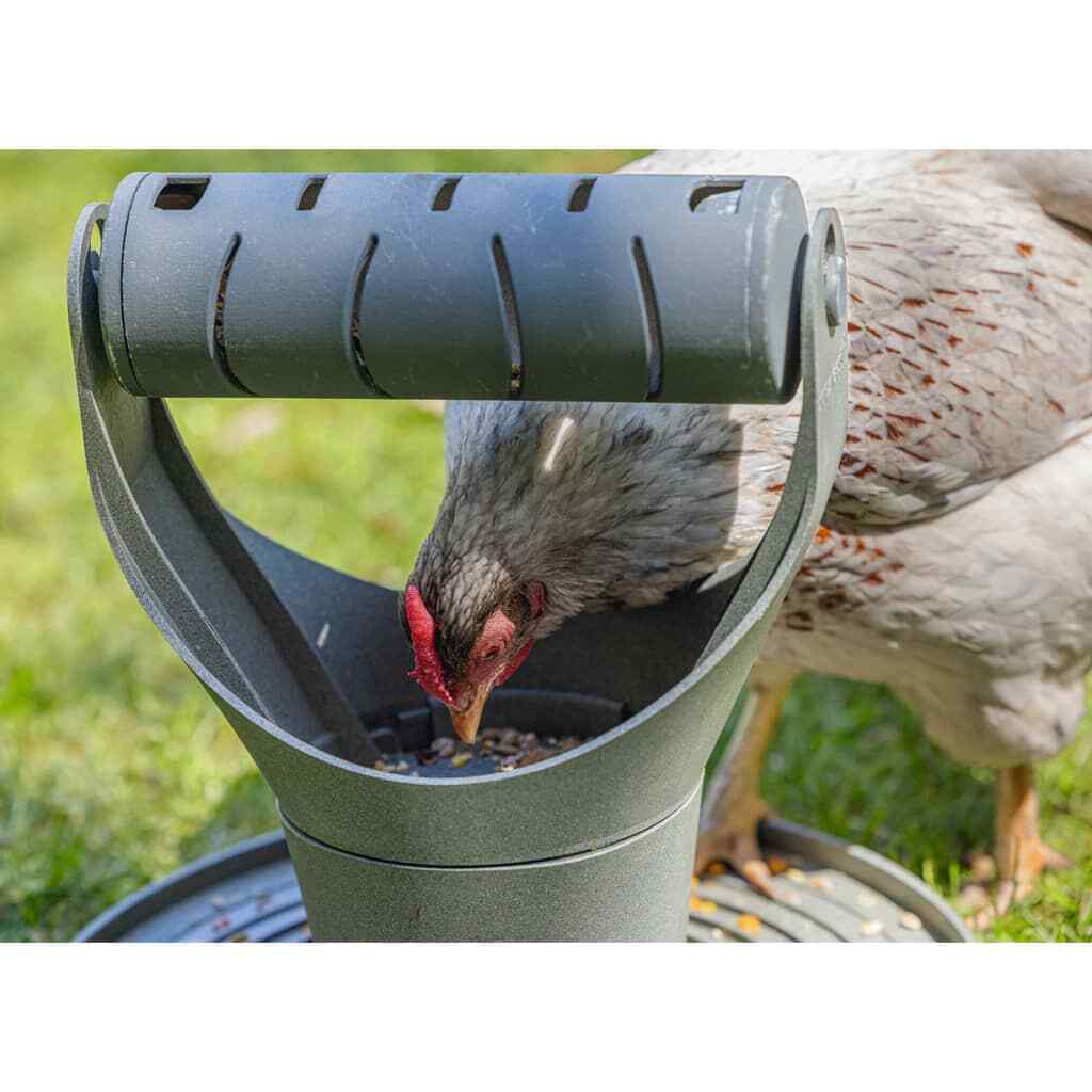 Dieser Spielturm uns Snackturm für Hüher dient der selbstständigen Beschäftigung. Bewegen die Hühner die Snackrolle indem sie daran picken, fällt das Futter heraus. Die Tiere müssen sich ihr Futter erarbeiten. Das verringert die Langeweile im Hühnergehege und bringt Abwechslung in den Alltag der Tiere.