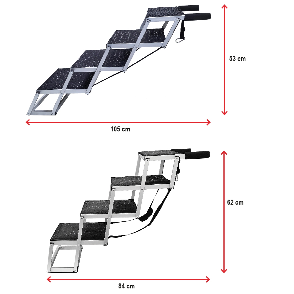 Die Aluminium-Klappleiter hat 4 Stufen und kann stufenlos für Höhen zwischen 53 und 62 cm verwendet werden. Sie besteht aus Aluminium, Kunststoff und Holzverstärkung und ist mit einer rutschfesten Trittfläche, einer Polsterung an der oberen Stützstrebe und einer rutschfesten Gummibeschichtung an der untersten Stufe ausgestattet. Ein Tragegriff erleichtert den Transport und ein Karabinerhaken sichert sie im Auto. Die Treppe ist für Hunde mit einem Gewicht von bis zu 75 kg geeignet und kann Gelenk- und Rückenproblemen vorbeugen.