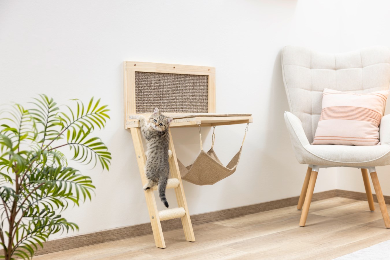 Katzen Wandliege, Liegebrett Timber - mit Kratzbrett, Hängematte und Katzenleiter - stilvolle Katzenmöbel zur Wandmontage