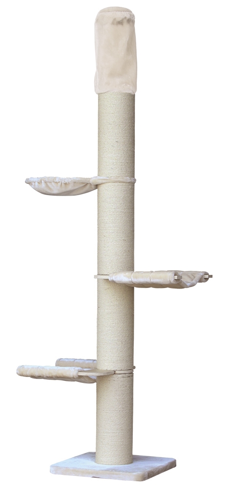 Er hat eine Grundfläche von 60 x 60 cm und ist höhenverstellbar zwischen 235 und 265 cm. So können Sie ihn optimal an Ihre Raumhöhe anpassen. Der Kratzbaum verfügt über einen Deckenspanner mit einer Abdeckung, die den Kratzbaum sicher an der Decke fixiert.
