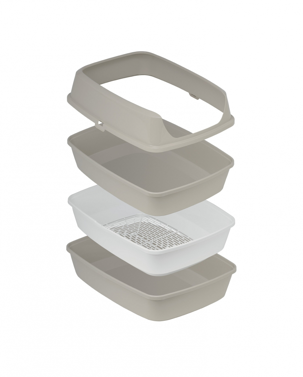 Die Katzentoilette besteht aus insgesamt 4 Teilen: 2 stabile Unterschalen, ein herausnehmbarer Siebeinsatz und dem hohen Rand.
