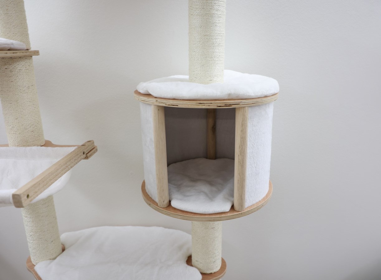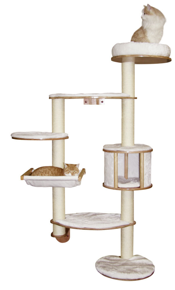Toller heller Kratzbaum, der platzsparend an der Wand befestigt werden kann. Sehr gut geeignet gerade für kleinere Wohnungen, selbstverständlich können Sie diesen Wandkratzbaum auch in einem großen Haus an einer Wand anbringen und natürlich auch beliebig erweitern. Der Boden bleibt frei und der Katzenbaum lässt Platz für andere Einrichtungsgegenstände. Auch die Reinigung der Umgebung des Kratzbaumes ist dadurch viel einfacher.