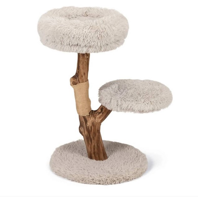 Natürlich gehört ein Kratzbaum zu jeder Grundausstattung einer Katze, denn das Wetzen der Krallen ist ein natürliches und wichtiges Bedürfnis Ihrer Tiere. Krallenwetzen dient zum Schärfen der Krallen für die Jagd nach Beute, aber auch zum Abbau von Stress und Energie.Dieser Kratzbaum aus natürlich geformten Echtholz ist nicht nur nützlich für Ihre Katze, er ist auch noch ein echter Hingucker für Frauchen und Herrchen. Er bietet mit seinen beiden Liegeflächen Platz für zwei Katzen. Beide Katzenbetten sind gemütlich gepolstert, damit Ihre Katze mit hohem Komfort ruhen und schlafen kann. Auch die Bodenplatte ist mit weichem Plüsch überzogen und dient als zusätzliche Liegefläche.