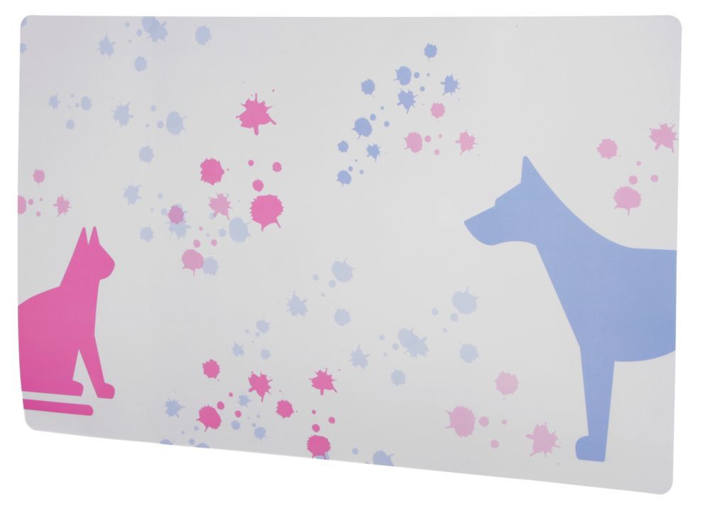 Die Grundfarbe ist weiß mit Hunde- und Katzenaufdruck in pink und blau.