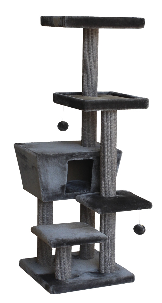 Dieser Katzenbaum ist komplett in dunkelgrau gehalten. Er steht auf einer stabilen Grundfläche von 48 x 48 cm, diese ist auch mit einem weichen Soft Plüschstoff überzogen und kann somit ebenfalls als Liegefläche von Ihrer Samtpfote genutzt werden. Mit einer Gesamthöhe von ca. 141 cm bietet dieser Kratzbaum eine Menge Entfaltungsmöglichkeiten für Ihre Katze.