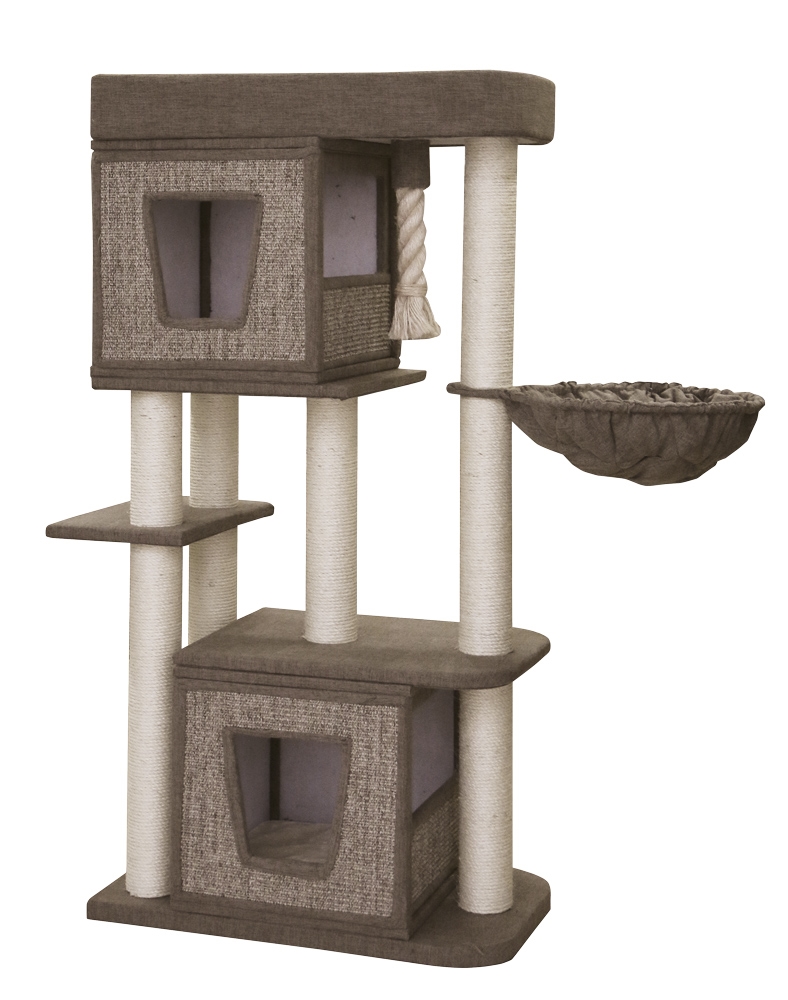 Der Kratzbaum besteht aus einem stabilen Holzgestell, das mit weichem Plüsch bezogen ist. Die Kratzstämme sind mit natürlichem Sisal umwickelt, das die Krallenpflege fördert und das Möbel vor Beschädigungen schützt. Der Kratzbaum verfügt über mehrere Ebenen, auf denen sich die Katzen ausruhen, spielen oder beobachten können. Die oberste Ebene ist eine geräumige Höhle, die als Rückzugsort oder Schlafplatz dient. Die mittlere Ebene ist eine Liegefläche mit einem Seil, das zum Toben animiert. Die unterste Ebene hate eine weitere Höhle in brauner Leinenoptik .