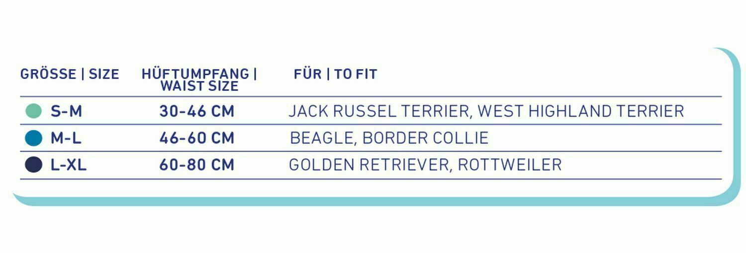 Um die richtige Größe zu ermitteln, messen Sie bitte Ihren Hund einmal um den Bauch (dort wo die Windel auch sitzen soll)