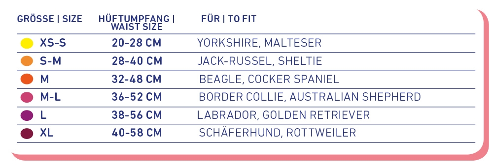 Um die richtige Größe zu ermitteln messen sie bitte Ihren Hund einmal um die Hüfte herum.
