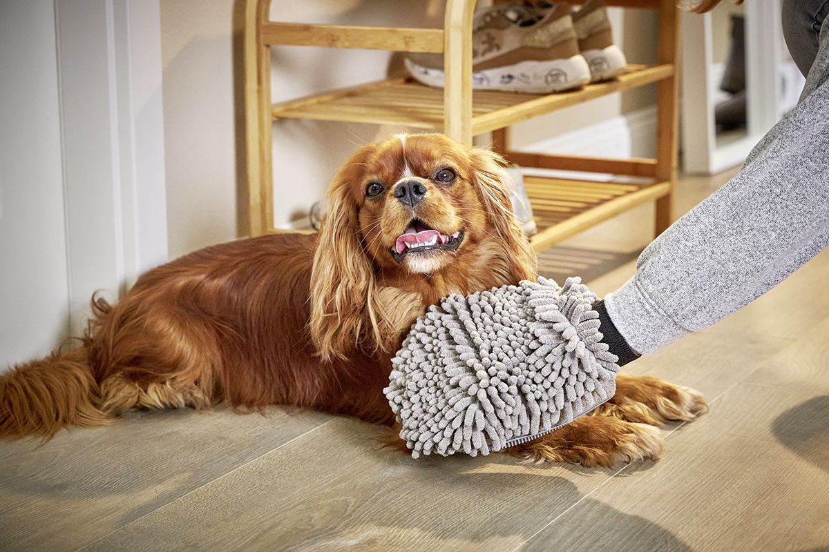Mit der Mikrofaserseite des Pflegehandschuhs können Sie ganz einfach den Schmutz und Feuchtigkeit nach einen regnerischen Spaziergang, von Ihrem Tier entfernen.